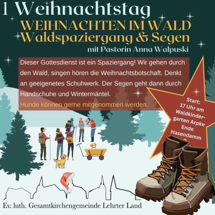 Am ersten Weihnachtstag starten wir um 17:00 Uhr am Waldkindergarten in Arpke (Ende der Hasendamm) zu einem Waldgottesdienst mit Andacht und Segen
