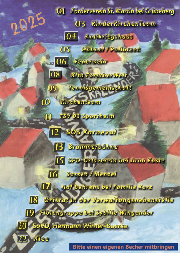 Am kommenden Montag, dem 1. Dezember beginnt in Sievershausen wieder der beliebte „Lebendige Adventskalender“. Von Montag bis Samstag sind alle im Dorf eingeladen zum Innehalten, Klönen und Singen. Die Gastgeber sorgen für heiße Getränke und Weihnachtsgebäck. Der Adventskalender beginnt immer um 18 Uhr. Die Gäste werden gebeten, einen eigenen Becher mitzubringen.