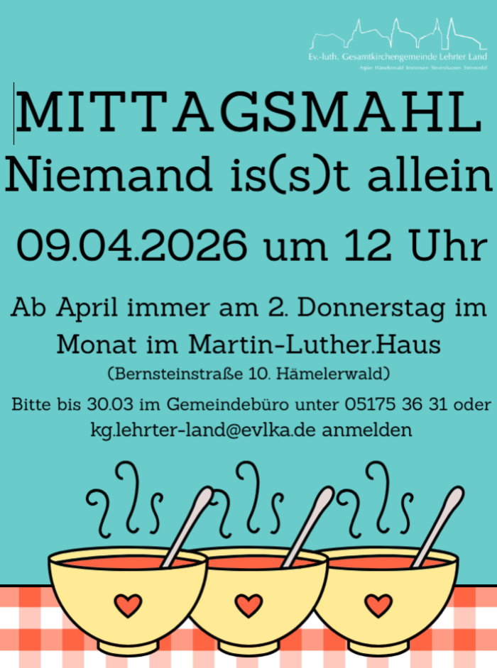 Ab April findet im Martin-Luther-Haus immer am 2. Donnerstag im Monat um 12 Uhr ein gemeinsames Mittagessen statt. Der erste Termin ist der 09.04.2026.