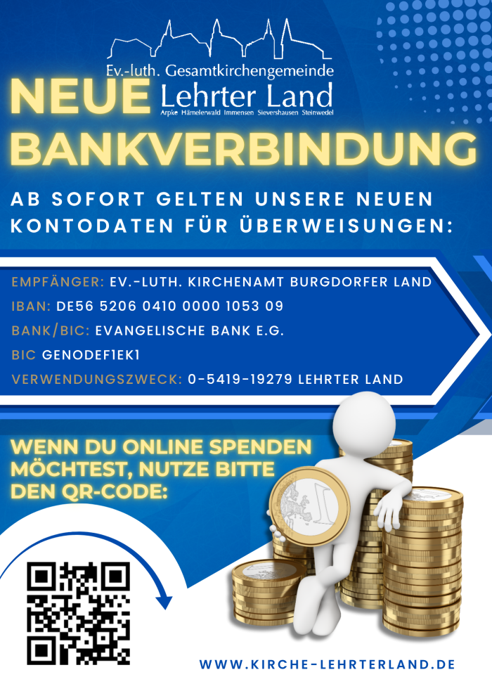Wir bitten Dich, Deinen Überweisungsauftrag entsprechend anzupassen und bedanken uns herzlich für Deine Unterstützung und Treue. Deine Spenden helfen uns, die vielfältigen Aufgaben unserer Gesamtkirchengemeinde Lehrter Land weiterhin zu erfüllen und besondere Projekte umzusetzen. Spenden auf dem alten Zahlweg erreichen uns weiterhin.