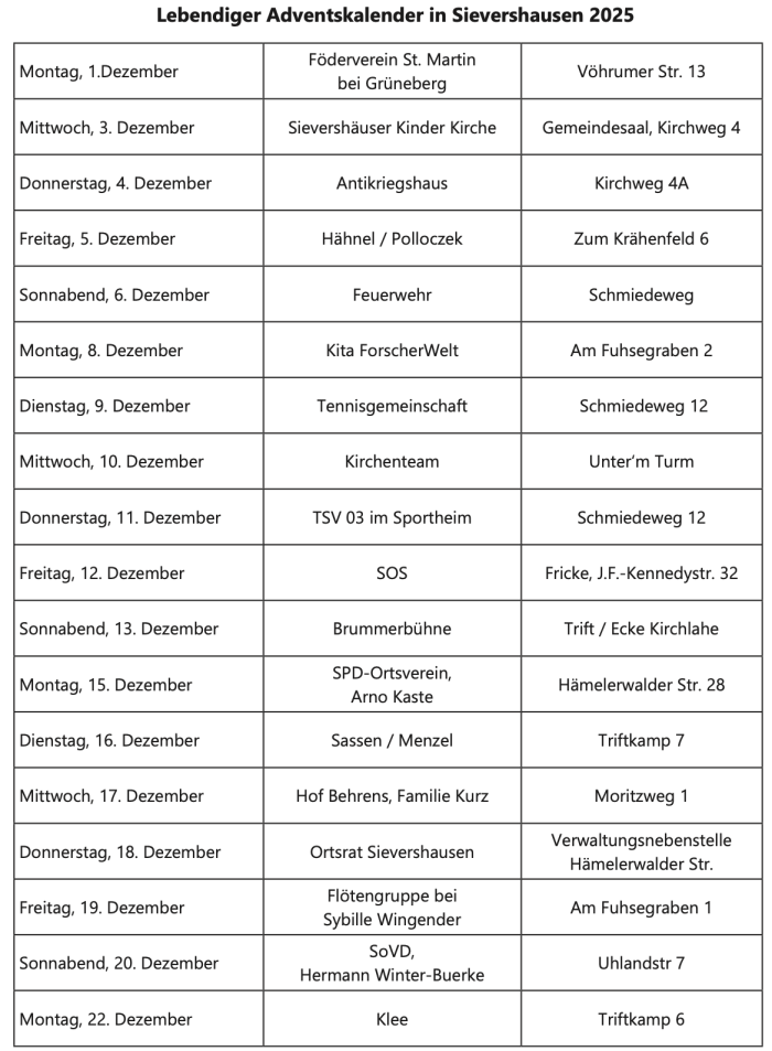 Am kommenden Montag, dem 1. Dezember beginnt in Sievershausen wieder der beliebte „Lebendige Adventskalender“. Von Montag bis Samstag sind alle im Dorf eingeladen zum Innehalten, Klönen und Singen. Die Gastgeber sorgen für heiße Getränke und Weihnachtsgebäck. Der Adventskalender beginnt immer um 18 Uhr. Die Gäste werden gebeten, einen eigenen Becher mitzubringen.