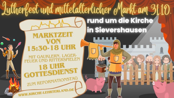 Letztes Jahr war er ein voller Erfolg, der Luthermarkt in Steinwedel. Dieses Mal findet das mittel-alterliche Treiben rund um die St. Martinskirche in Sievershausen statt, mit Lagerfeuer, Essen und Getränken aus der Zeit Martin Luthers. Es warten Gaukler, Ritterspiele und Handwerkszeug, alles mit vorbereitet von den aktuellen Konfis.