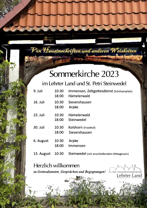 Liedstrophen, Kurzgebete, Lebensmottos ... All das findet man immer wieder auf Balken von Fachwerkhäusern. Im Rahmen der Sommerkirche im Lehrter Land blicken wir auf solche Inschrif-ten, die offenbar so wichtig sind, dass sie einen vornehmen und dauerhaften Platz einnehmen.