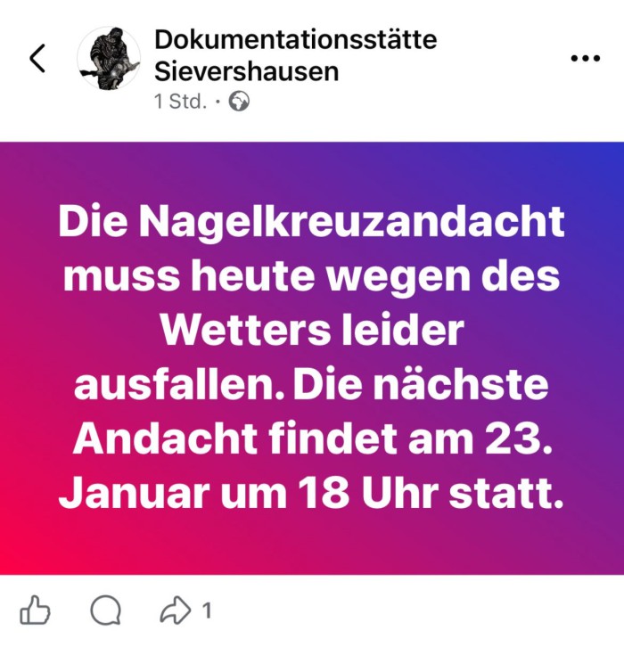 Nagelkreuzandacht fällt heute leider witterungsbedingt aus